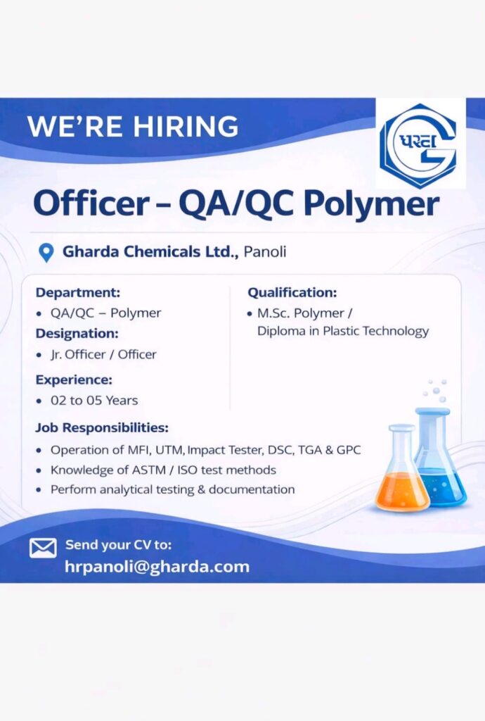 Gharda Chemicals Ltd, a leading chemical manufacturing company, is hiring experienced professionals for its QA/QC Polymer Department at the Panoli plant.