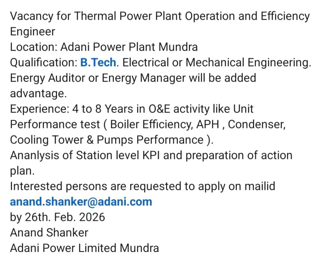 Introduction: Vacancy for Thermal Power Plant Operation & Efficiency Engineer | Adani Power Limited – Mundra | Apply by 26 Feb 2026